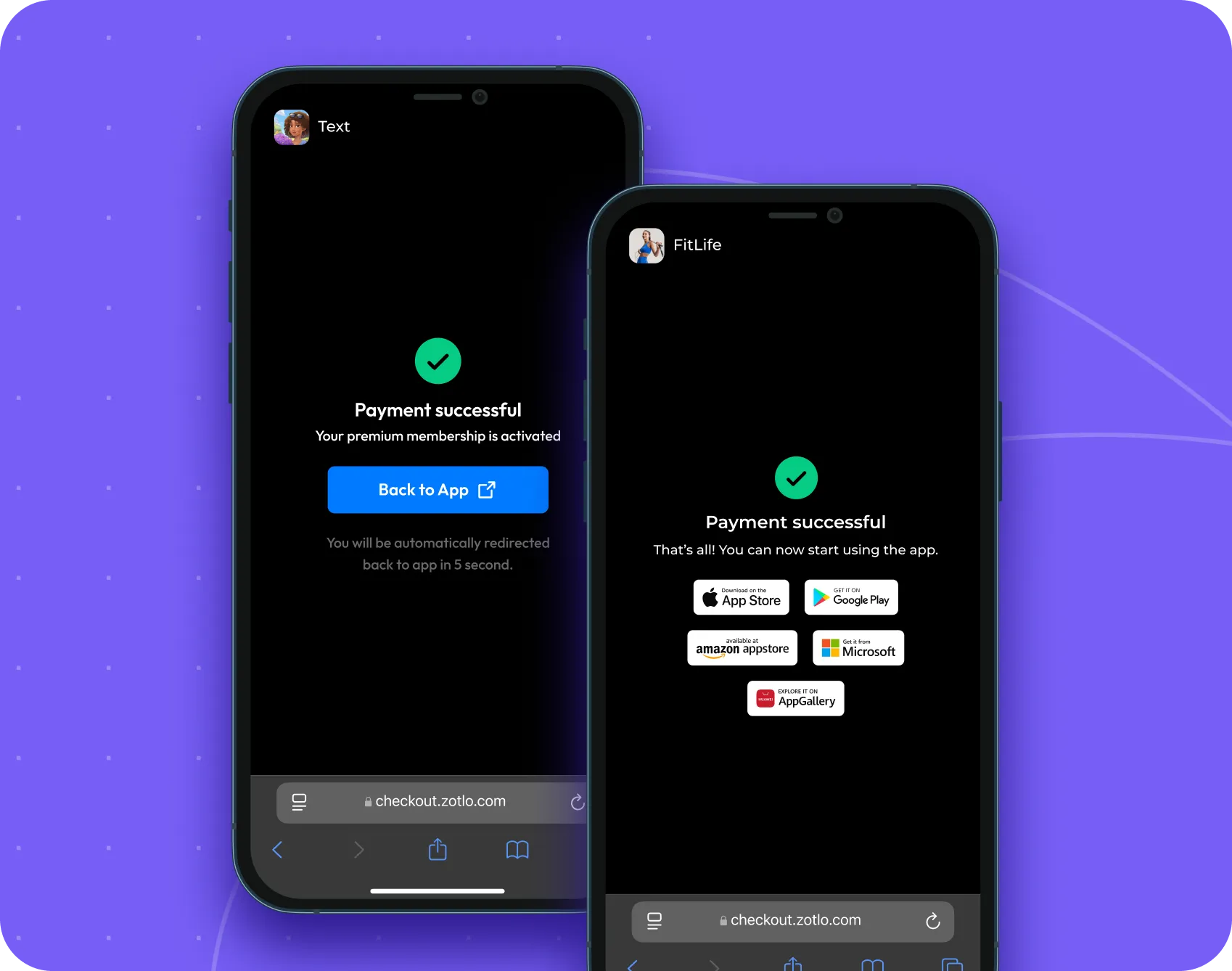 Guide your users to the right next step after a successful payment — no code required. Send them to your app, store page, website, or a custom deep link with just a few clicks.