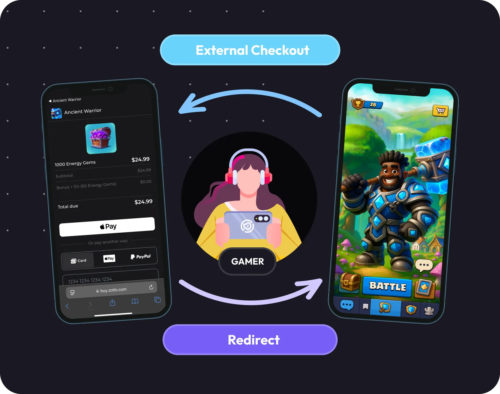 With Zotlo, you can implement external payment flows that comply with Apple's policy — enabling users to complete purchases on the web without leaving your game experience behind.