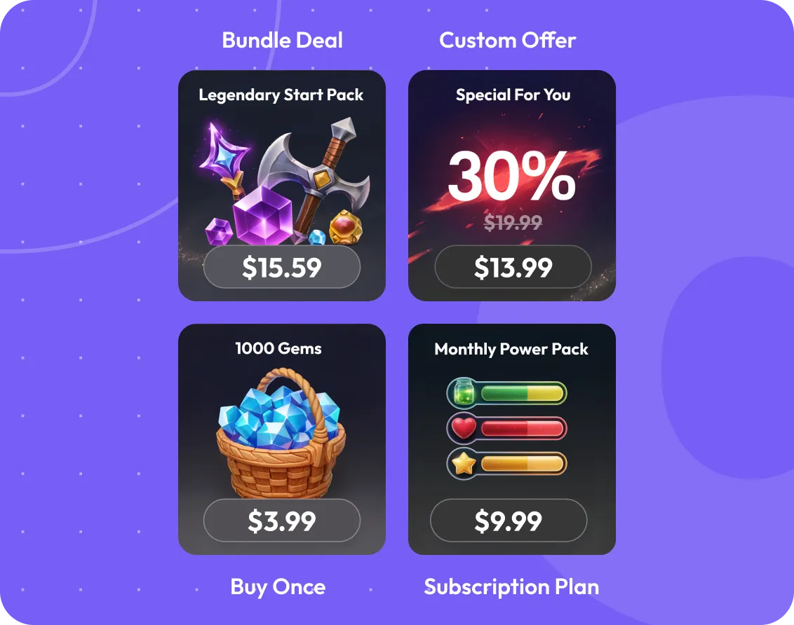 Support one-time purchases, subscriptions, bundles, bonuses, and discounts.