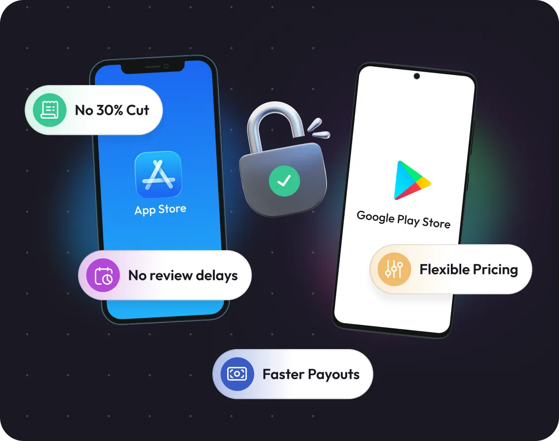 Take control of your monetization—no revenue sharing, no pricing restrictions, no delayed approvals. Sell subscriptions, bundles, upgrades, or one-time purchases directly from your website.