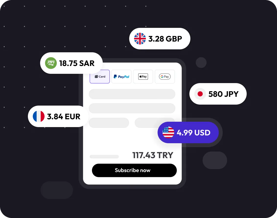 Set custom prices for any country, currency, or user segment — no tiers, no limits. Zotlo’s adaptive pricing engine automatically adjusts prices based on FX rates and local purchasing power.