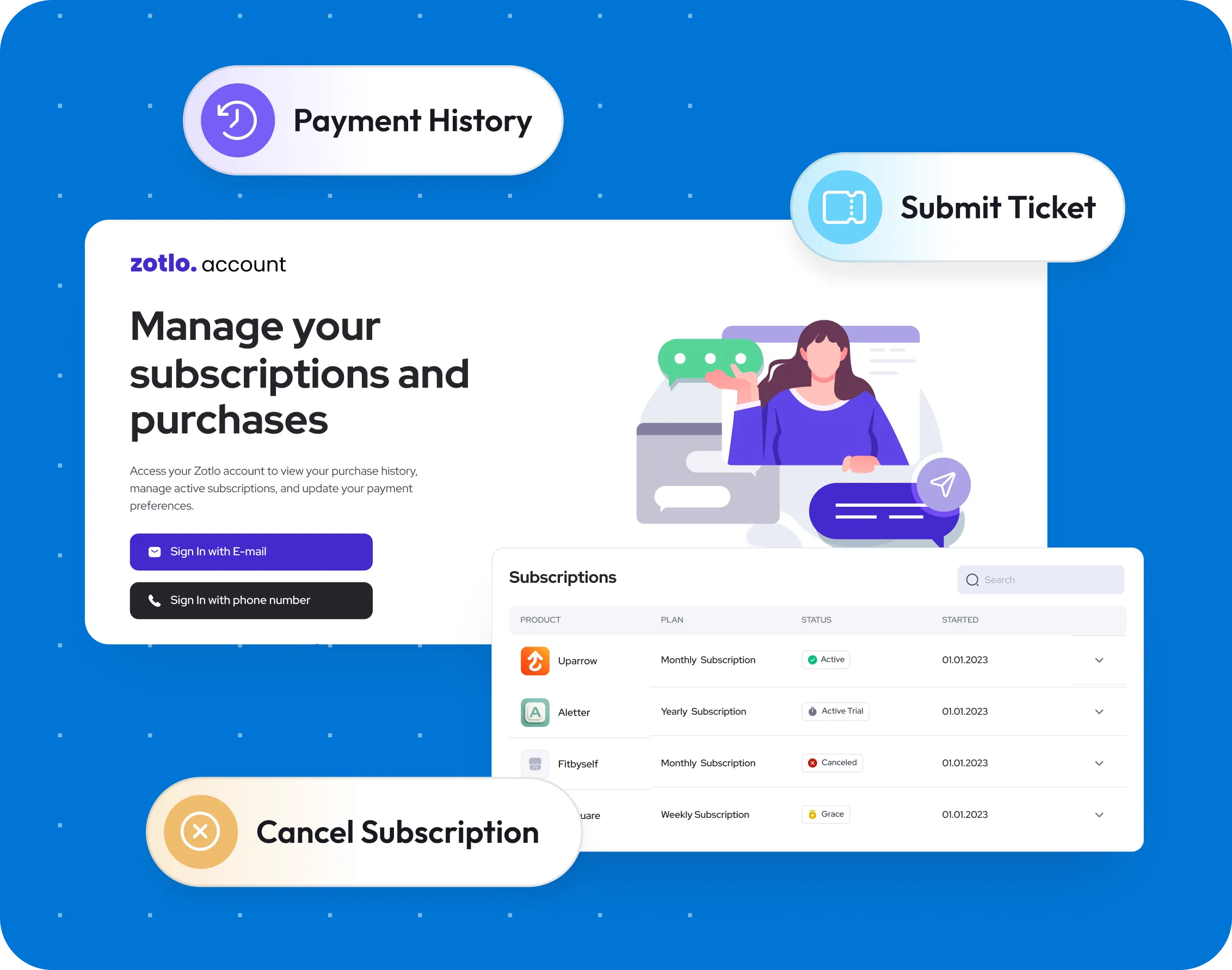 Zotlo lets you launch, grow, and optimize recurring revenue across apps, SaaS, and digital services with powerful tools for pricing, trials, user access, and recovery.
